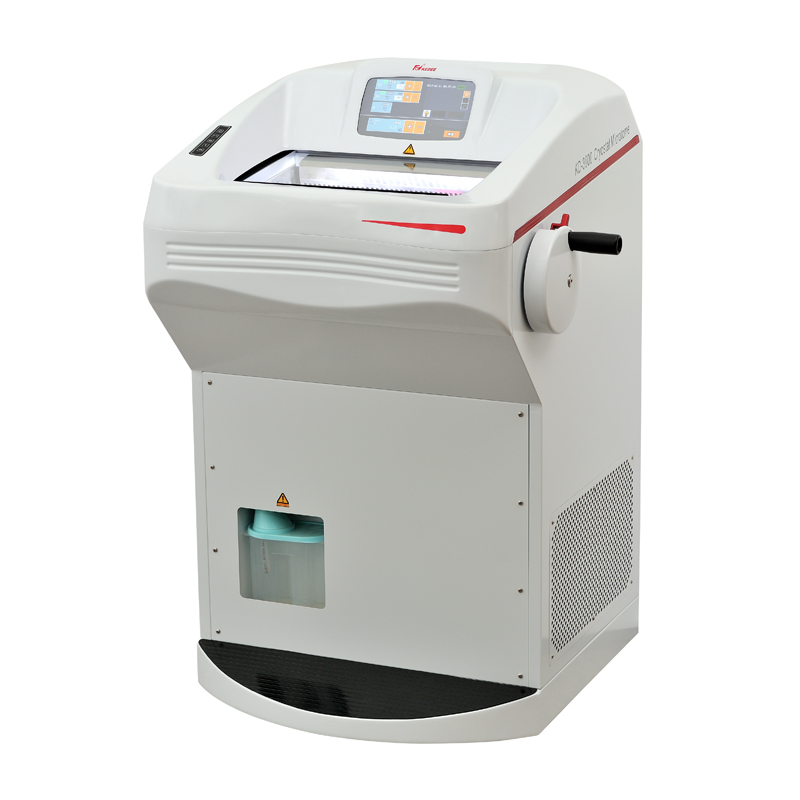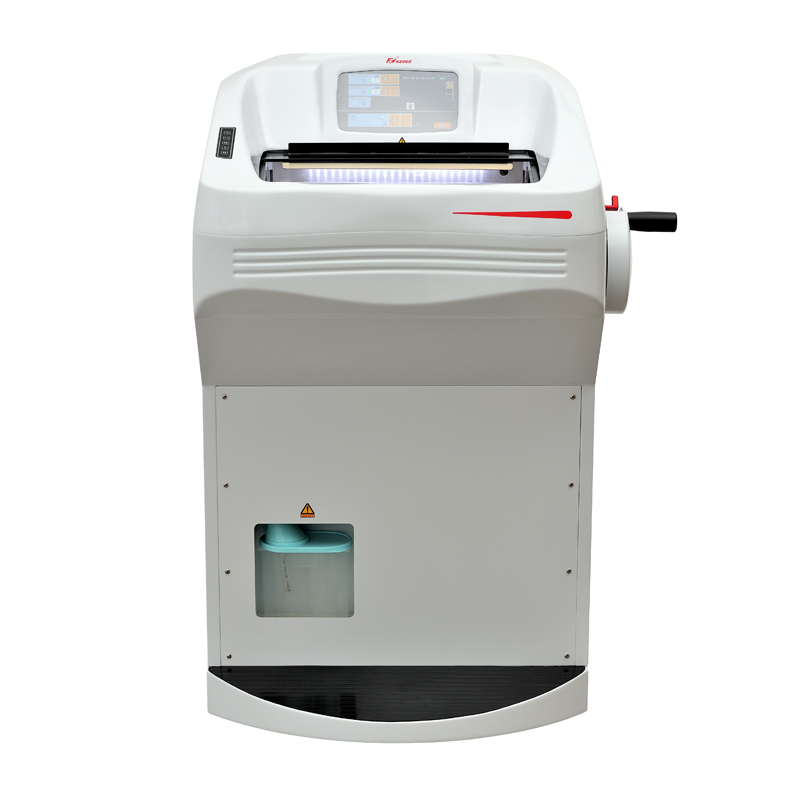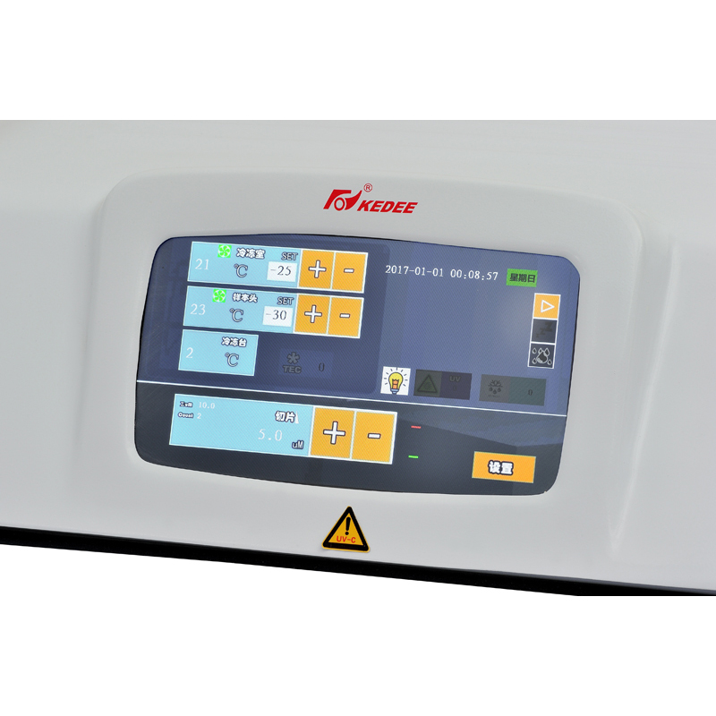 ◇ 配备10英寸彩色液晶触摸显示屏,智能人机交互界面,操作易懂便捷、简单,实时同屏清晰显示所有参数(切片总数量、切片总厚度、切片厚度、标本回缩值、温度控制状态、设备运行状态、时间、温度、定时休眠开关机、除霜等)